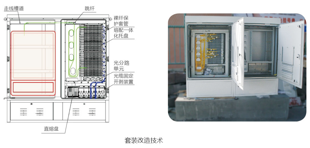 采用(yong)套裝(zhuang)改造(zao)技(ji)術(shù),新(xin)箱體(ti)采用(yong)前(qian)後(hou)側面單(dan)開們(men)結構(三開們(men)),側艙相對獨立,并按無跳接光纜交接箱結構製(zhi)作(zuò)。