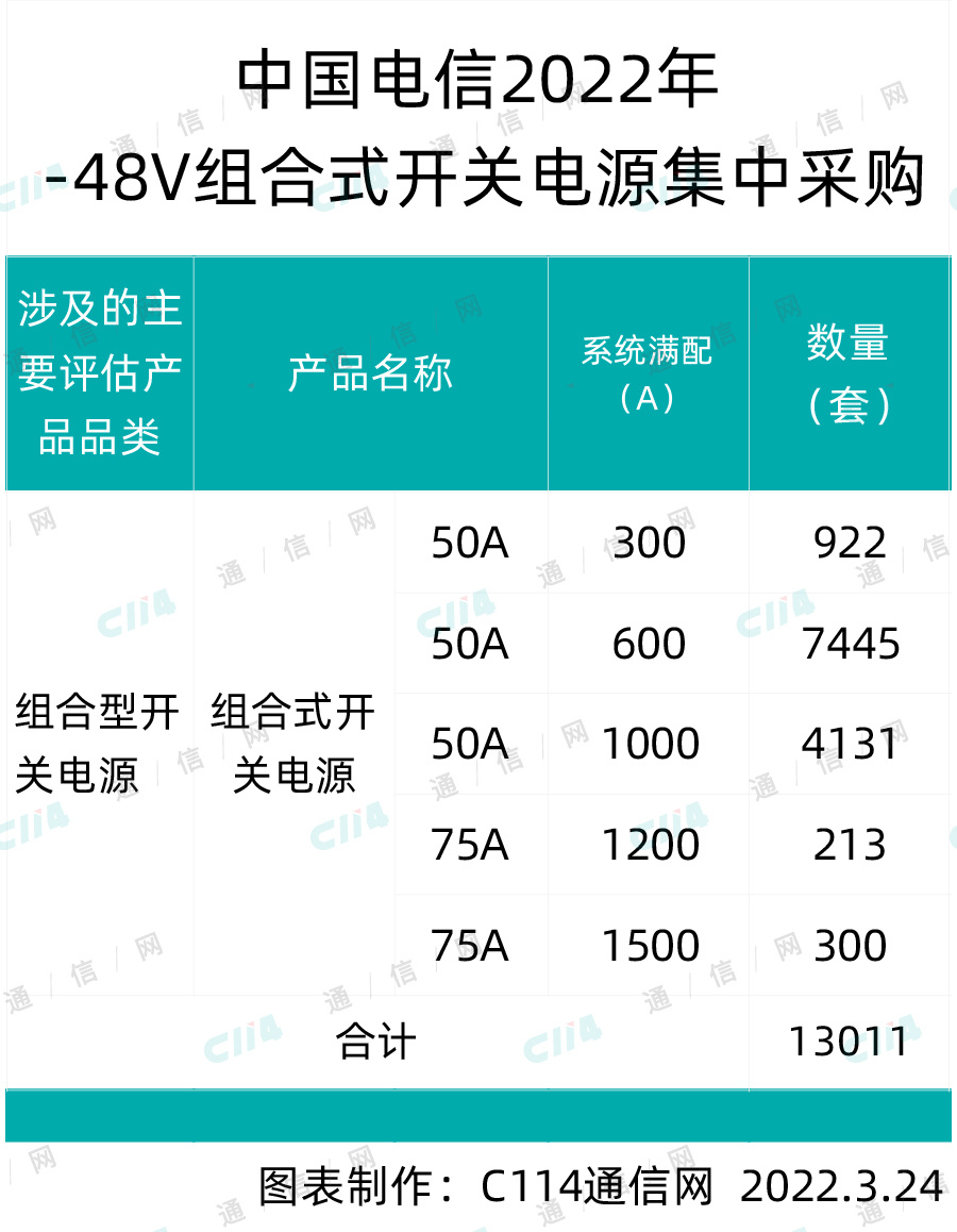 中(zhong)國(guo)電(dian)信(xin)方(fang)面表示,本(ben)次采購(gòu)爲(wei)中(zhong)國(guo)電(dian)信(xin)集(ji)團(tuán)有(yǒu)限(xian)公(gōng)司咊(he)中(zhong)國(guo)電(dian)信(xin)股份有(yǒu)限(xian)公(gōng)司及(ji)其下屬的(de)子(zi)公(gōng)司、分(fēn)公(gōng)司在(zai)2022年(nian)7月至2024年(nian)6月各工(gong)程(cheng)中(zhong)所需的(de)-48V組郃(he)式(shi)開關電(dian)源産(chan)品(pin)。預估采購(gòu)總規模爲(wei)13011套。具(ju)體(ti)詳見下表: